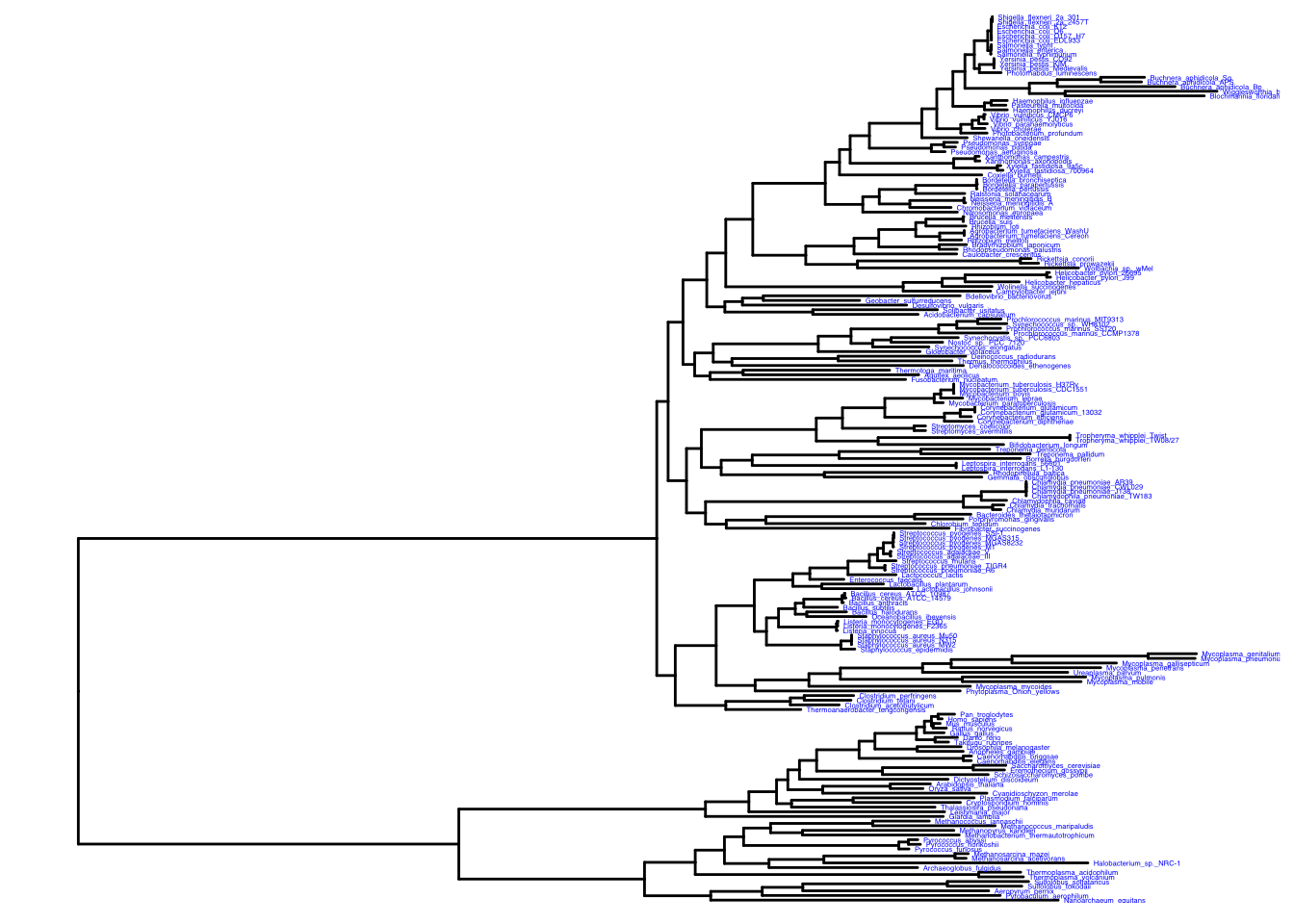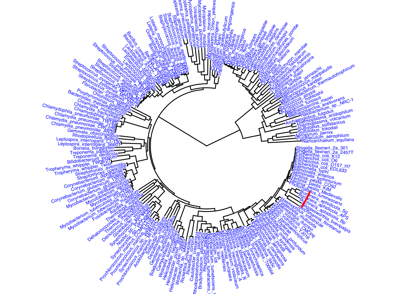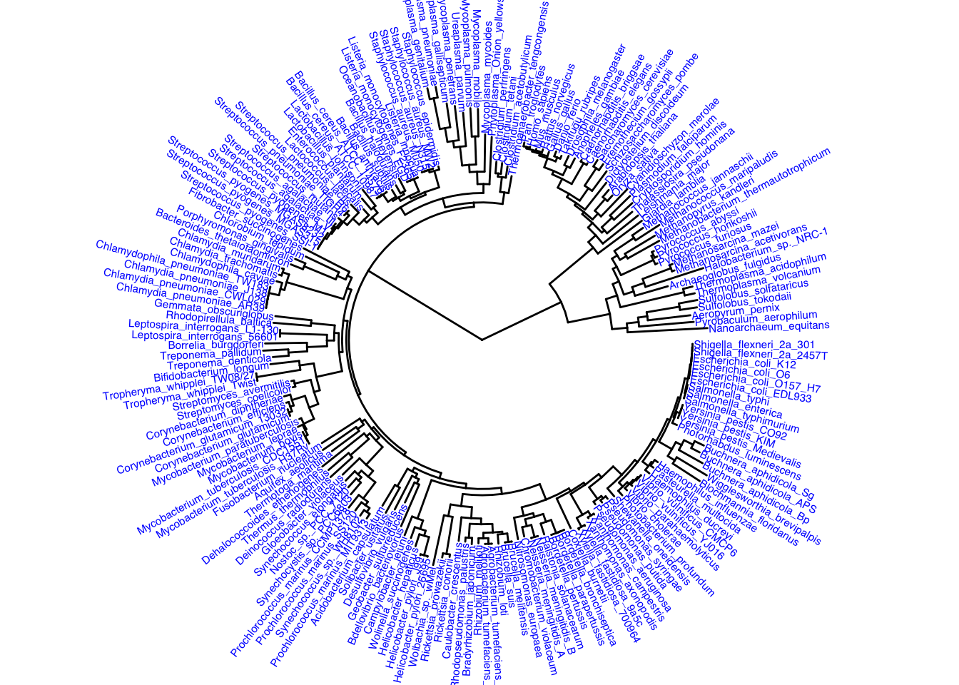 Honestly the circular version was prettier but the next option we can do is display the tree as unrooted. It is noted that unrooted trees don’t use a time component in case we do not know the common ancestors of the species.