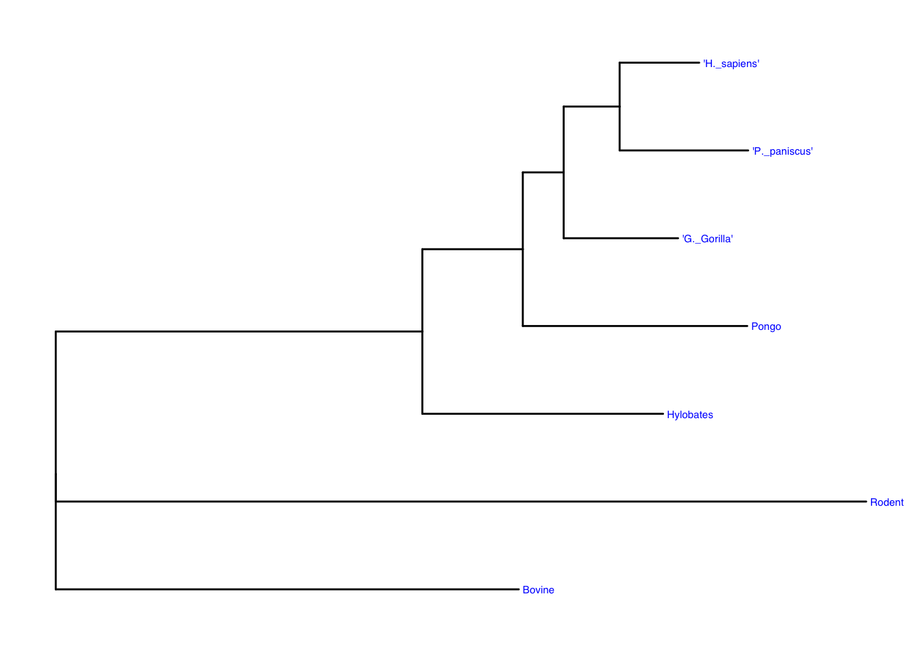 General findings: There are five terminal taxa with the same common ancestor. The rodent and bovine both have no internal nodes. p. paniscus, and h. sapiens make sense as the two terminal species as the most present species. Bovine and rodent are useful in comparing against the internal nodes of the other five mammals of interest and shows the common ancestors and sister groups well.